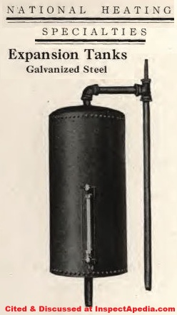 The galvanized steel expansion tank, complete with sight glass, appeared in the 1920 National Boilers & Radiators catalog that we cite below.