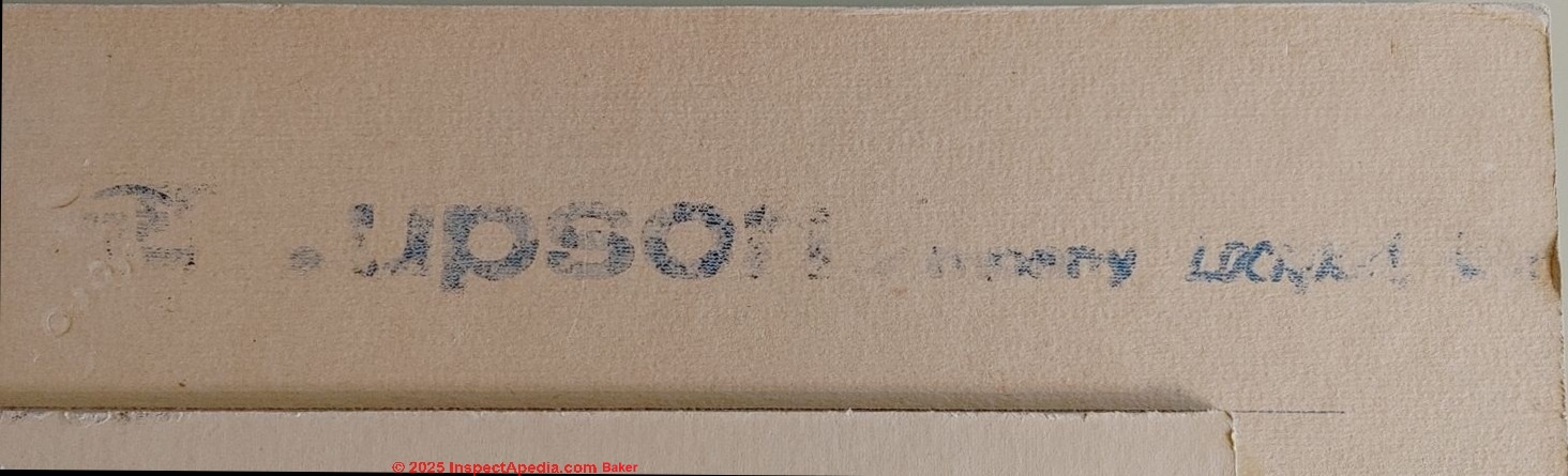 Above and below: Identifying stamps for Upsonboard, in this instance used as a painting base, courtesy of an InspectApedia reader in Oregon.