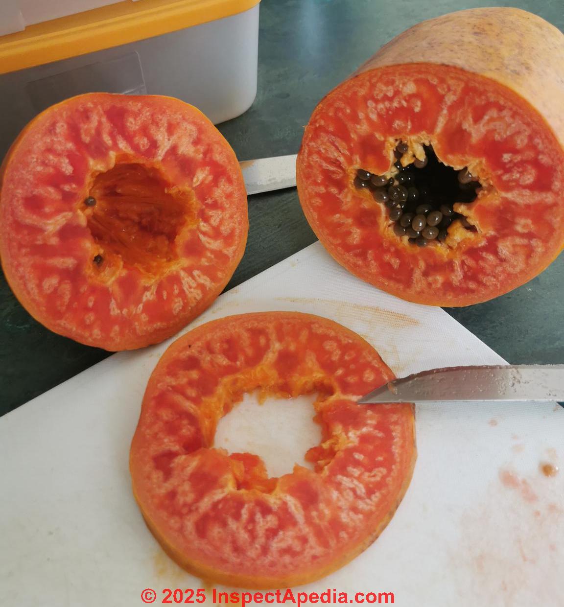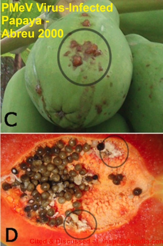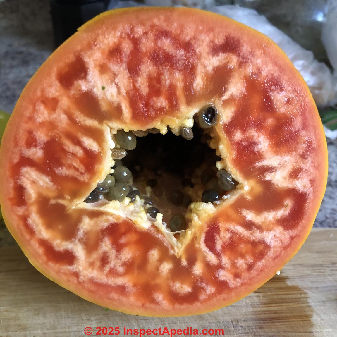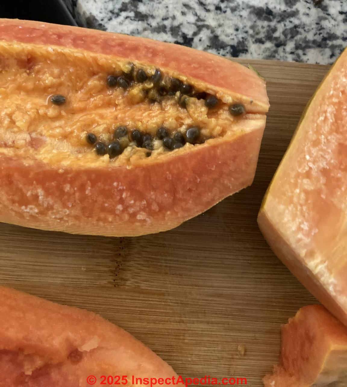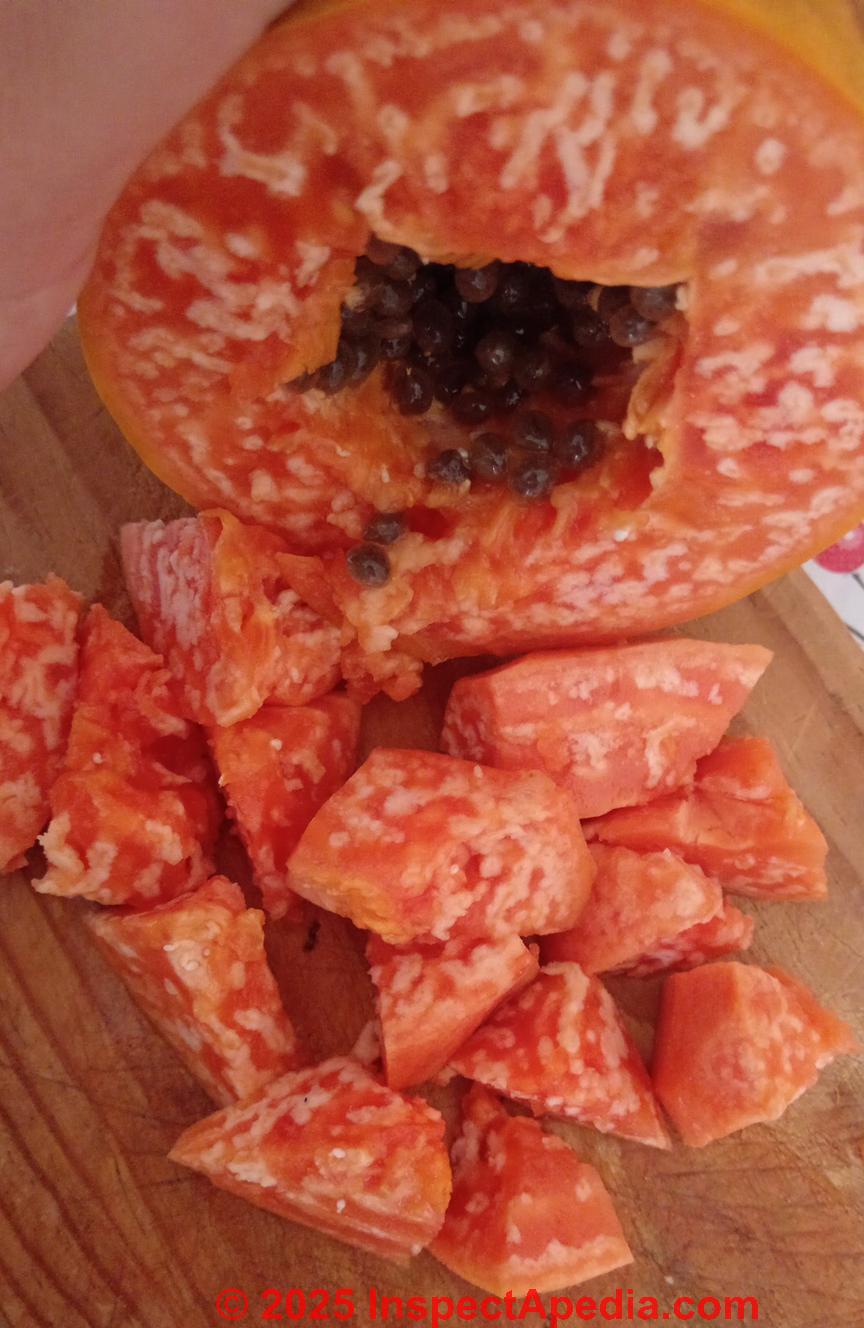 PAPAYA WHITE GROWTH vs DISEASE at InspectApedia.com - online encyclopedia of building & environmental inspection, testing, diagnosis, repair, & problem prevention advice.