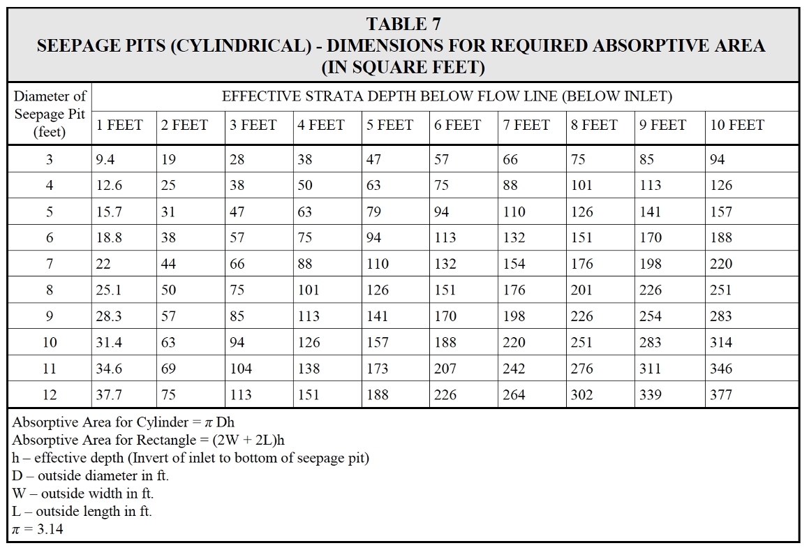The table below shows the size of seepage pit necessary in order to provide the required soil absorption area for seepage pits. First use the preceding table to determine the necessary seepage pit absorption area, then use this table (below) to determine the necessary seepage pit size to provide that absorption area.